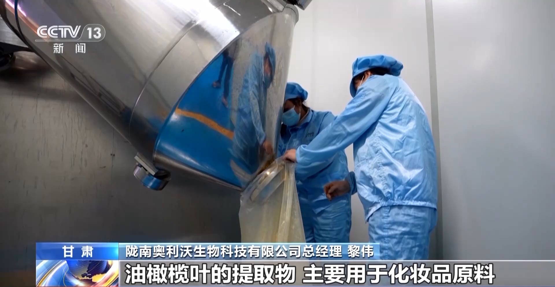 陇南奥利沃生物科技有限公司总经理 黎伟:油橄榄叶的提取物大多数都用在化妆品原料;油橄榄果渣主要是提取山楂酸,用于饲料添加,提取完之后所有的废渣,我们会做成生物质颗粒;果核分出来之后能做成高端活性炭。在副产物方面,我们综合利用率能达到70%。