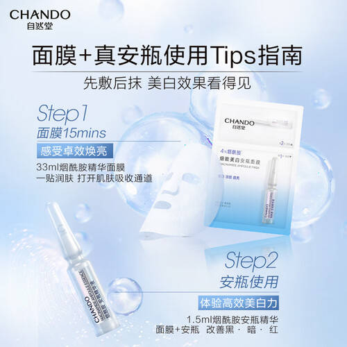 自然堂安瓶面膜则以4%烟酰胺为核心成分,温和配方经过敏感肌测试,适合敏感肌肤使用。这使得它在补水保湿的同时,不会造成肌肤负担,很适合需要急救修护的消费者。